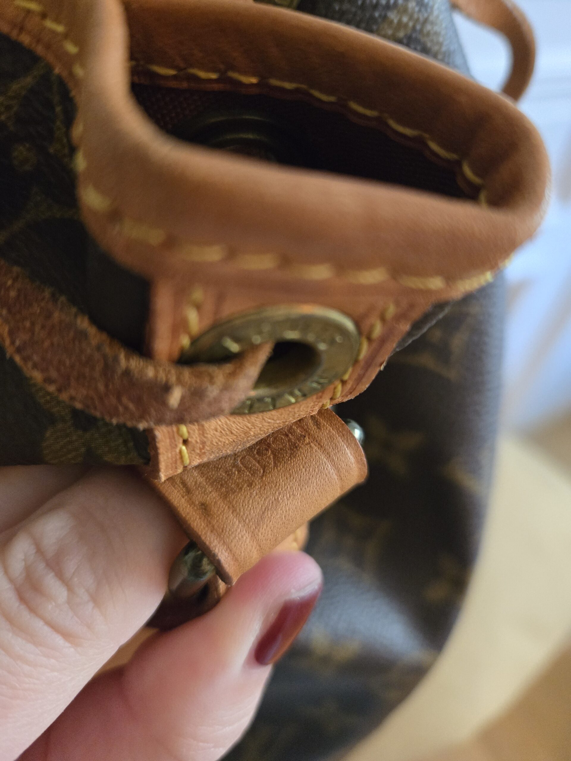 Die Tasche befindet sich in einem sehr schönen Vintage Zustand. Die Lederelemente sind alle gut erhalten, teilweise weisen sie einige ganz kleine, harmlose, dem Alter entsprechenden Gebrauchsspuren auf. Das Monogram Canvas ist super erhalten. Im Inneren der Tasche befinden sind ganz kleine, ebenfalls harmlose Gebrauchsspuren (kleiner getrockneter Fleck). Die Louis Vuitton Nieten am Rand sind fast neuwertig und glänzen traumhaft schön.