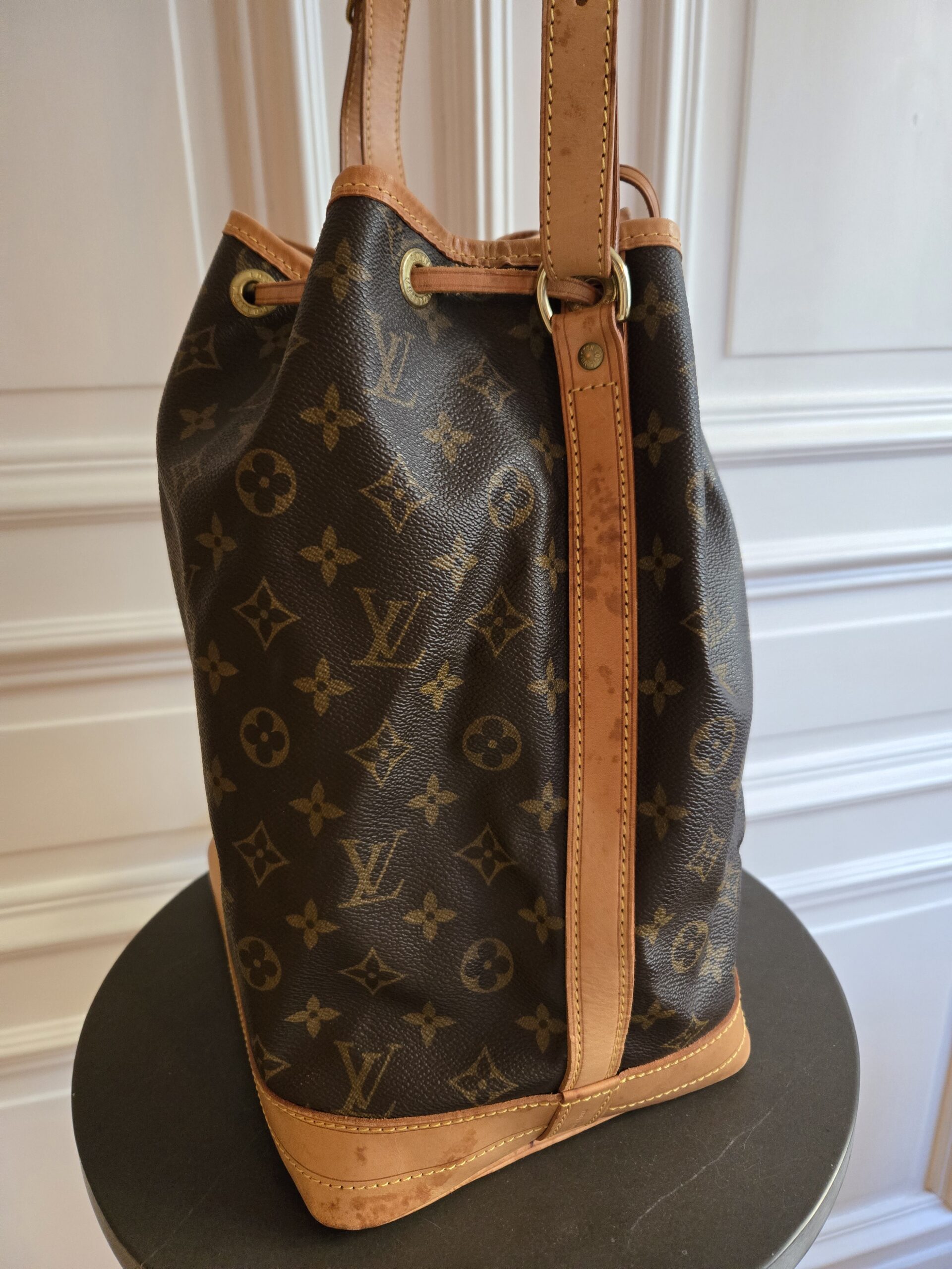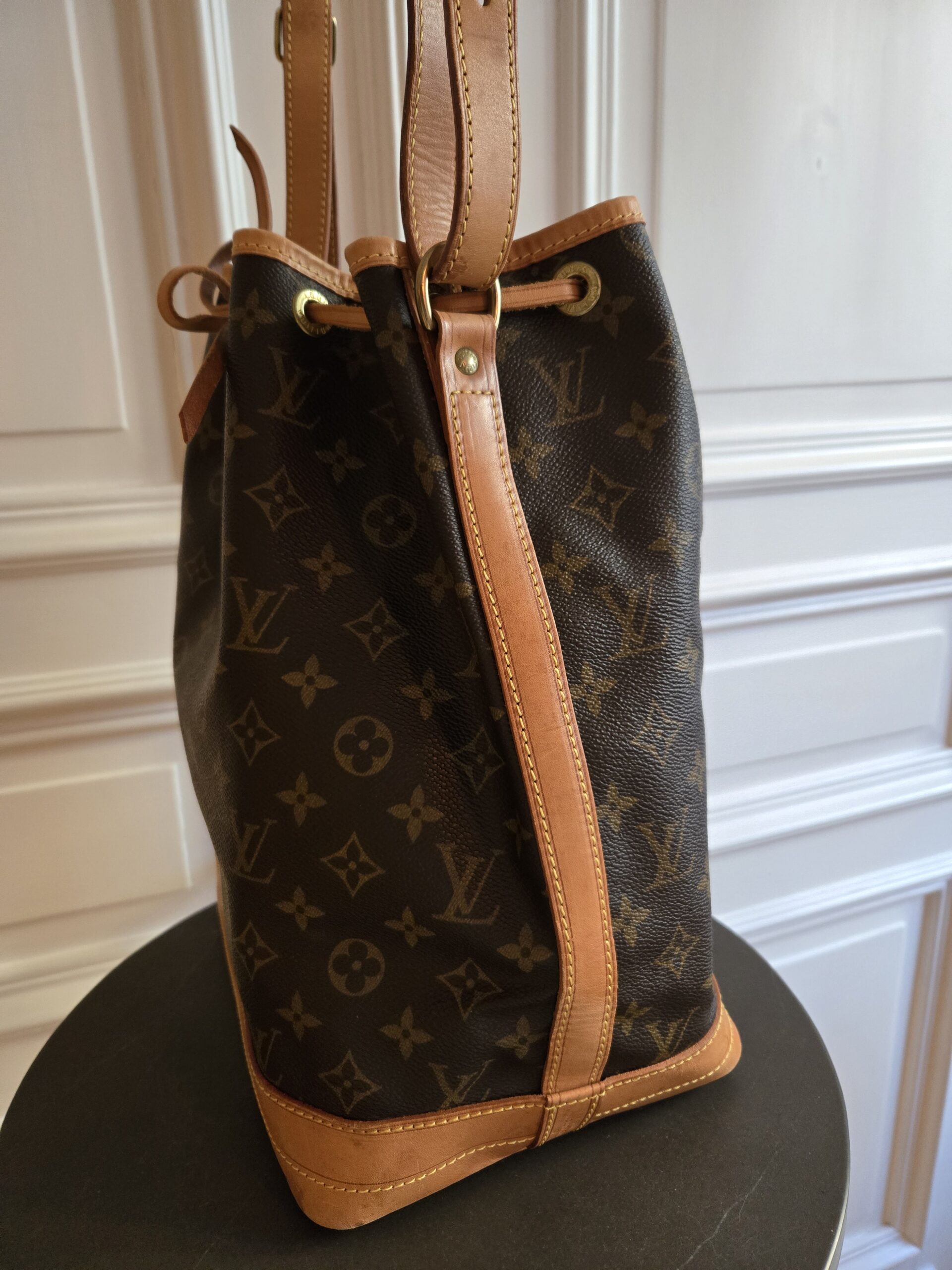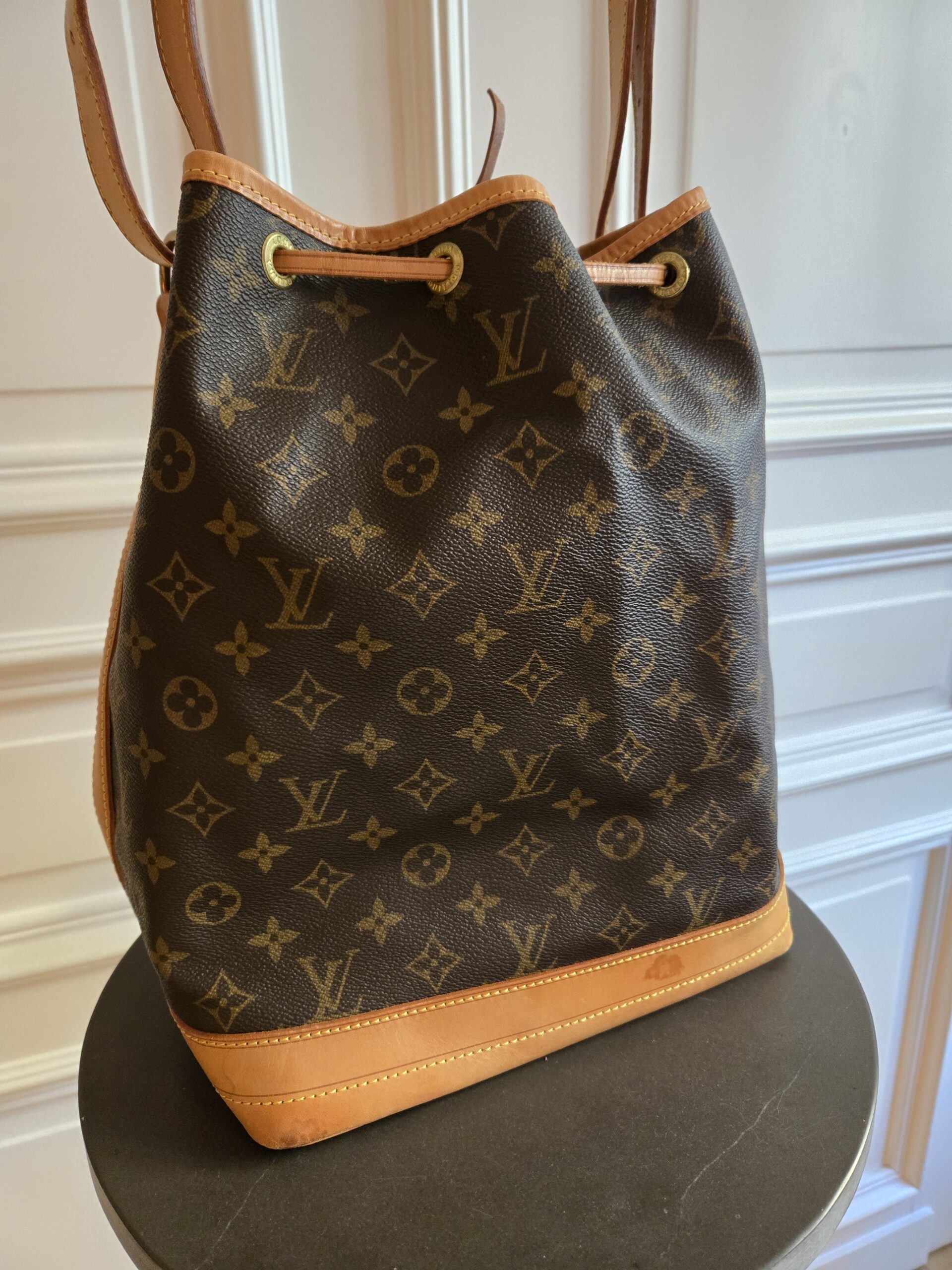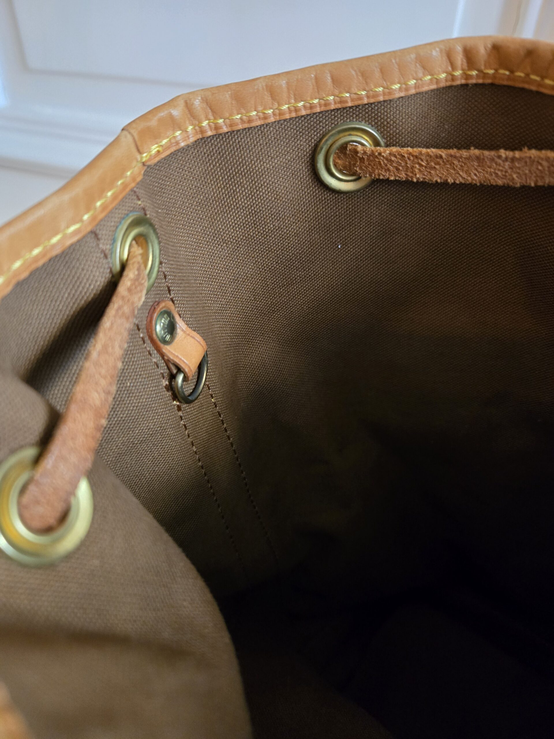 Die Tasche befindet sich in einem wunderschönen Vintage Zustand. Die Lederelemente sind alle sehr gut erhalten, teilweise weisen sie einige, dem Alter entsprechenden Gebrauchsspuren auf. Das Monogram Canvas ist super erhalten. Das Zugband weist geringe Gebrauchsspuren auf, ist stellenweise etwas steif und rissig. Das Innere der Tasche ist absolut ok.