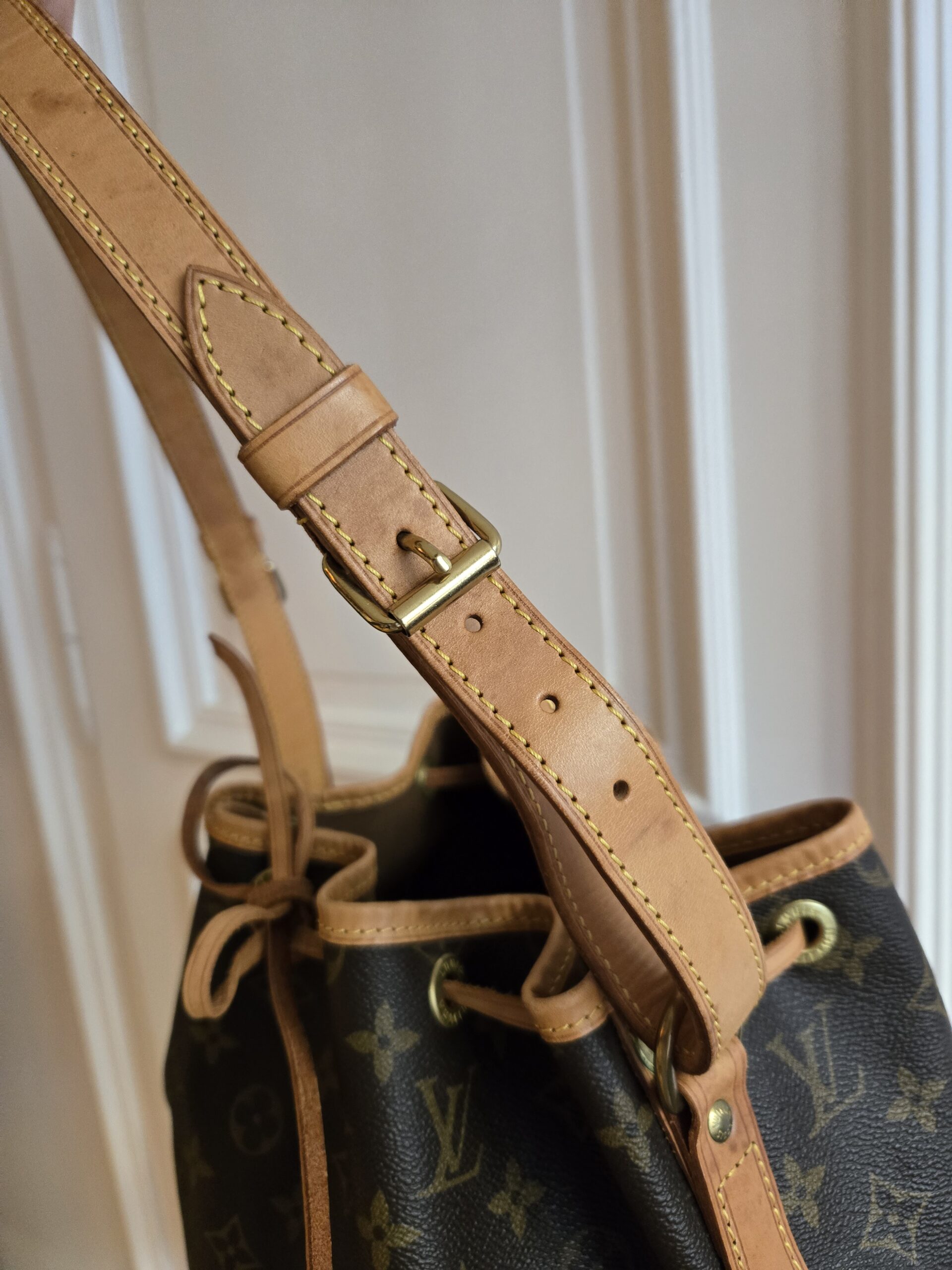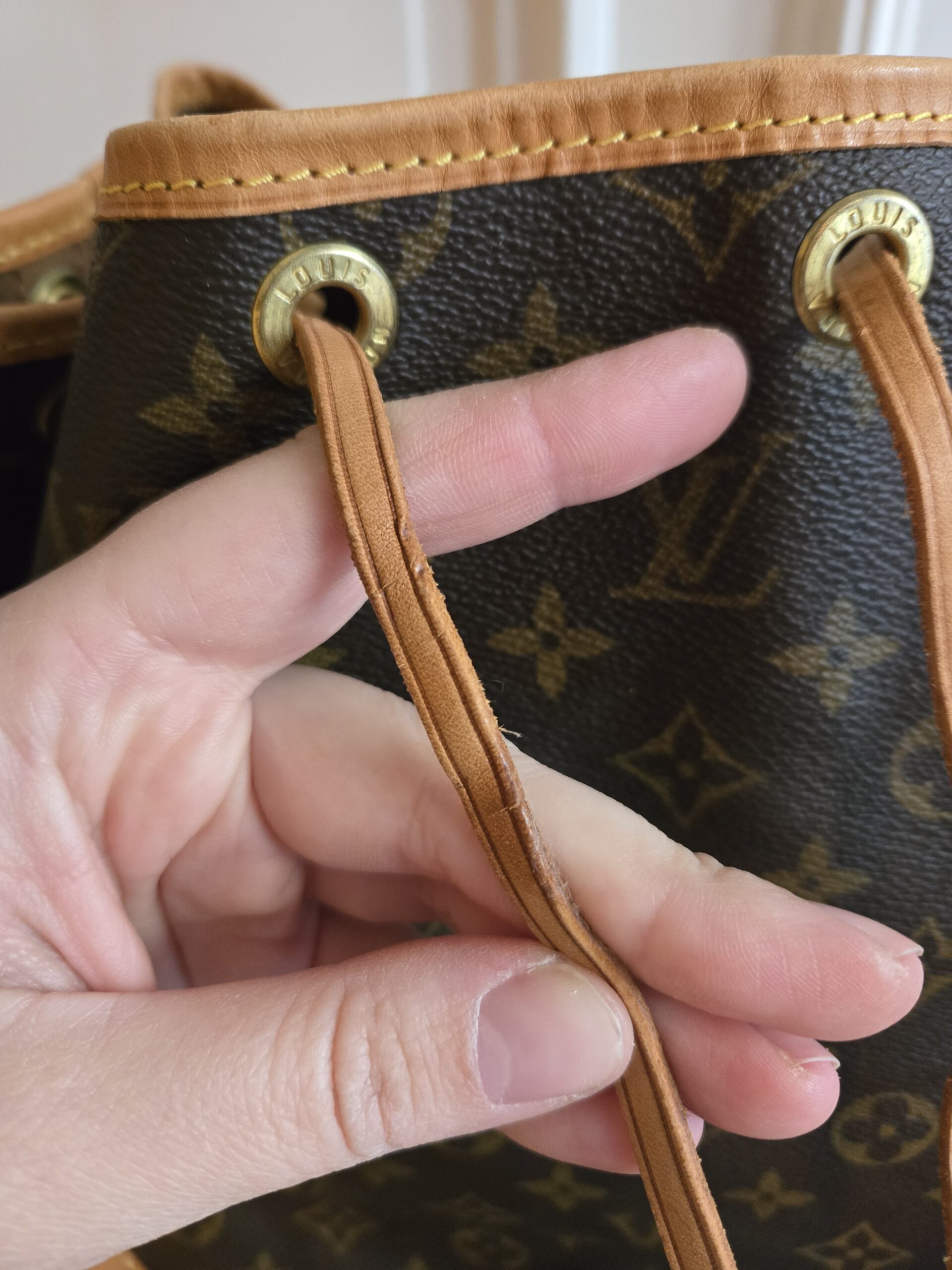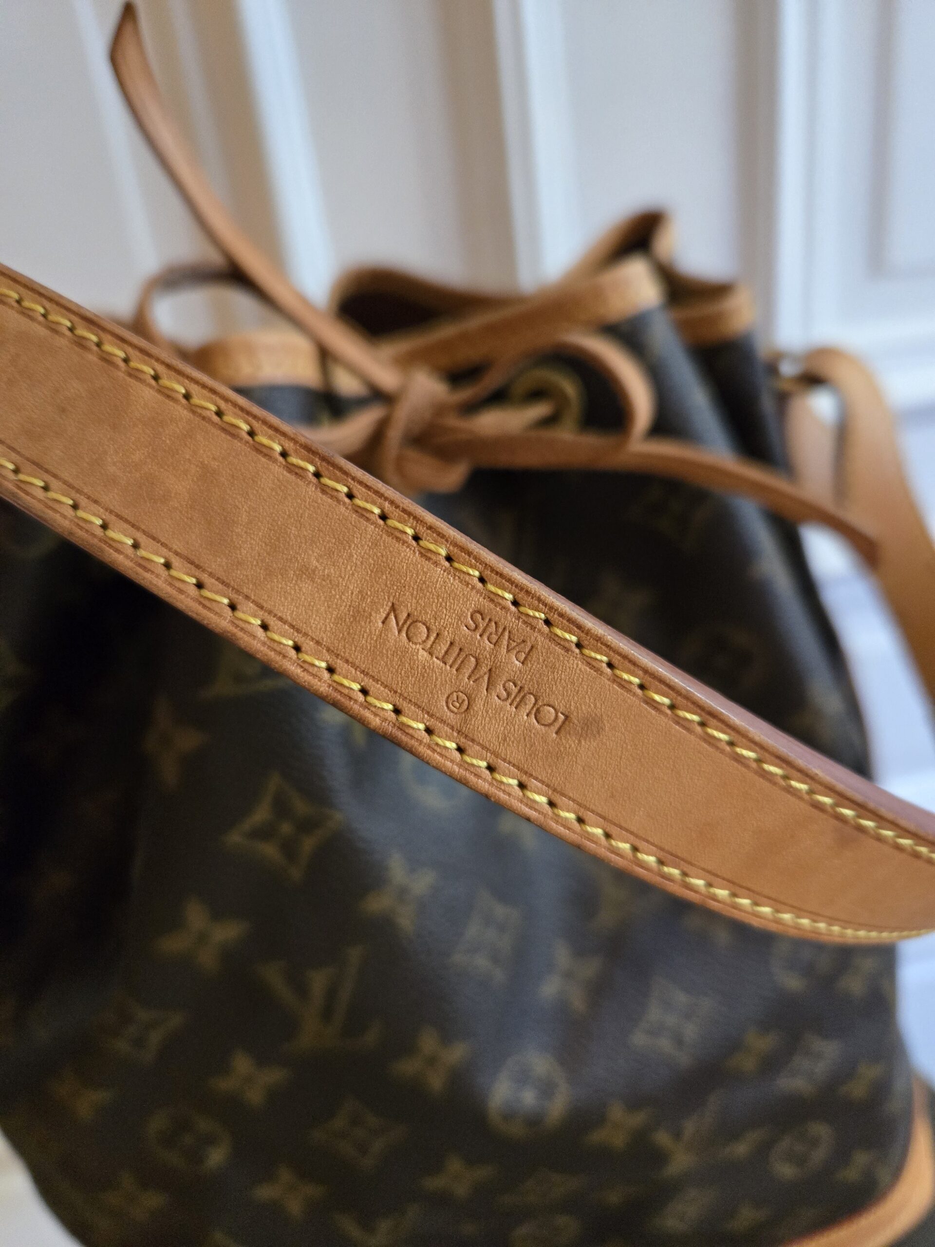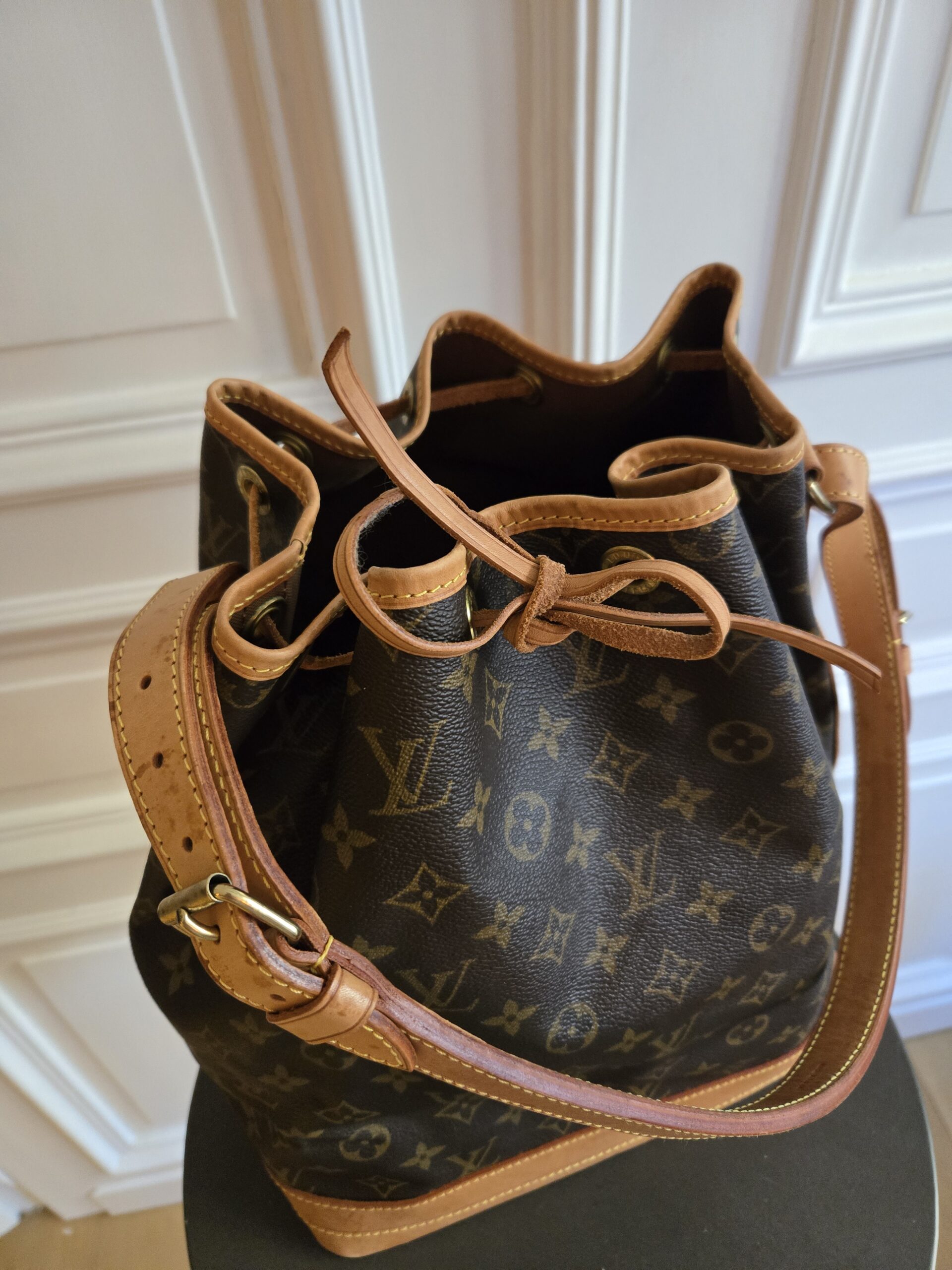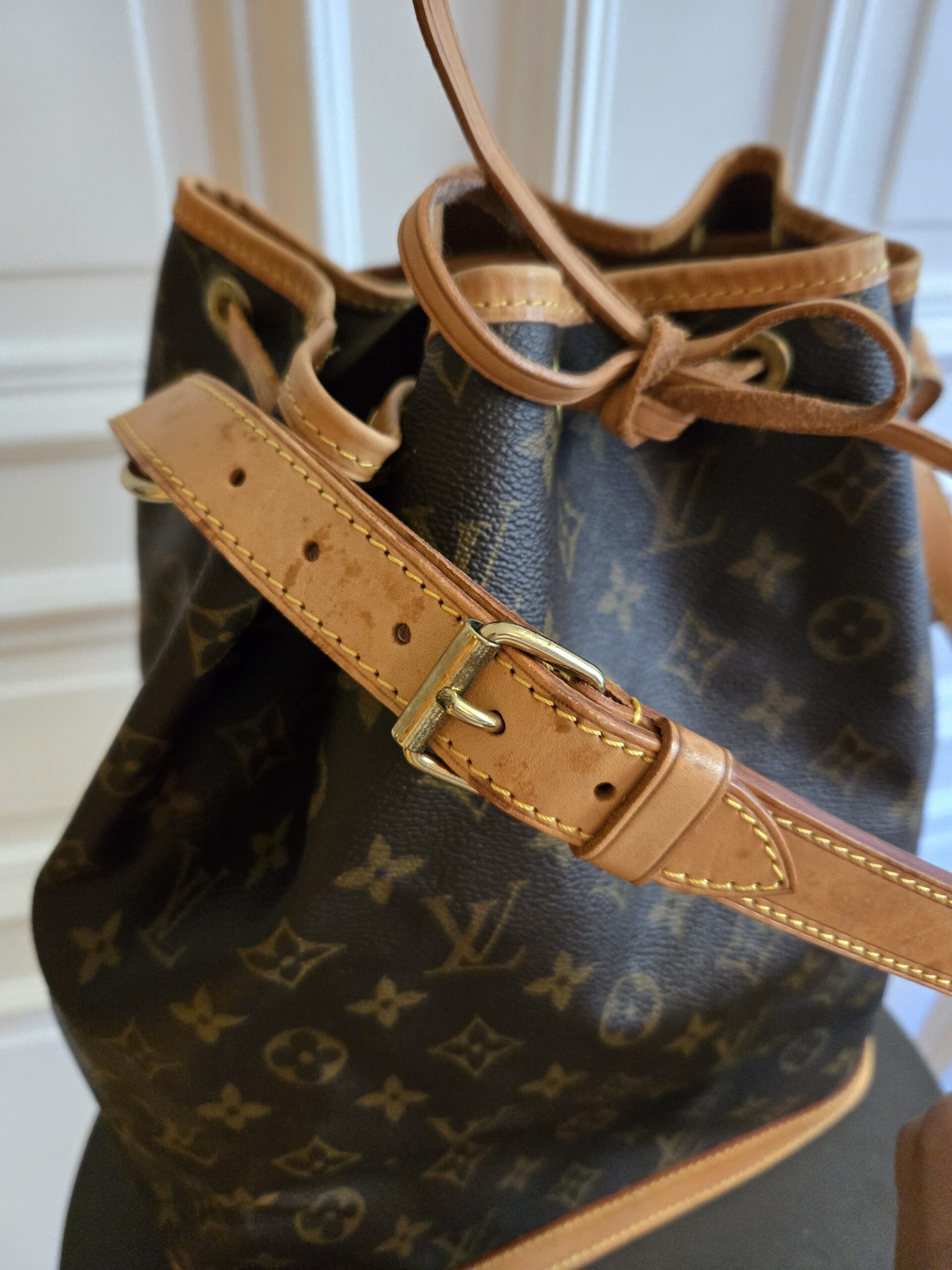 Die Tasche befindet sich in einem wunderschönen Vintage Zustand. Die Lederelemente sind alle sehr gut erhalten, teilweise weisen sie einige, dem Alter entsprechenden Gebrauchsspuren auf. Das Monogram Canvas ist super erhalten. Das Zugband weist geringe Gebrauchsspuren auf, ist stellenweise etwas steif und rissig. Das Innere der Tasche ist absolut ok.