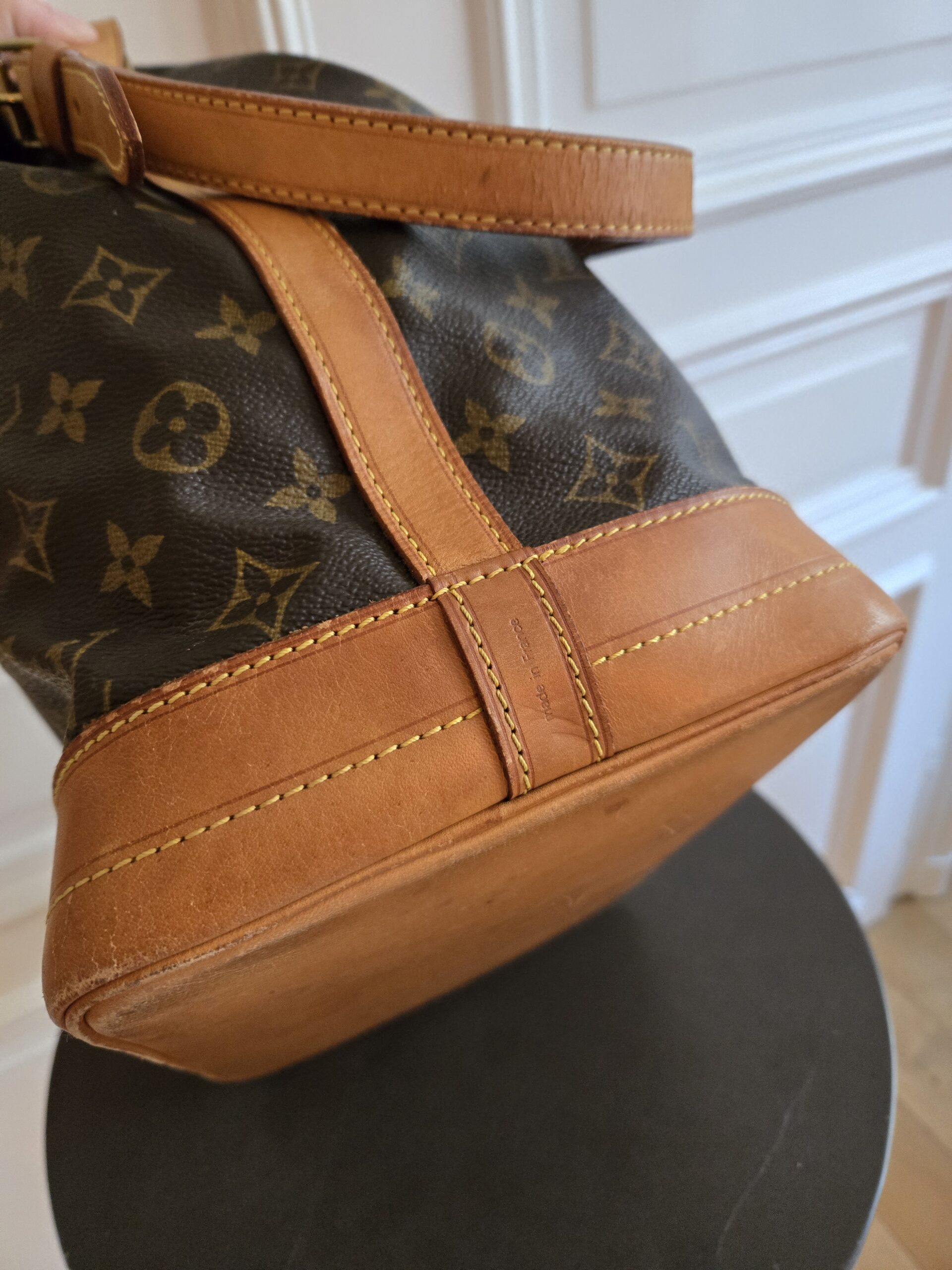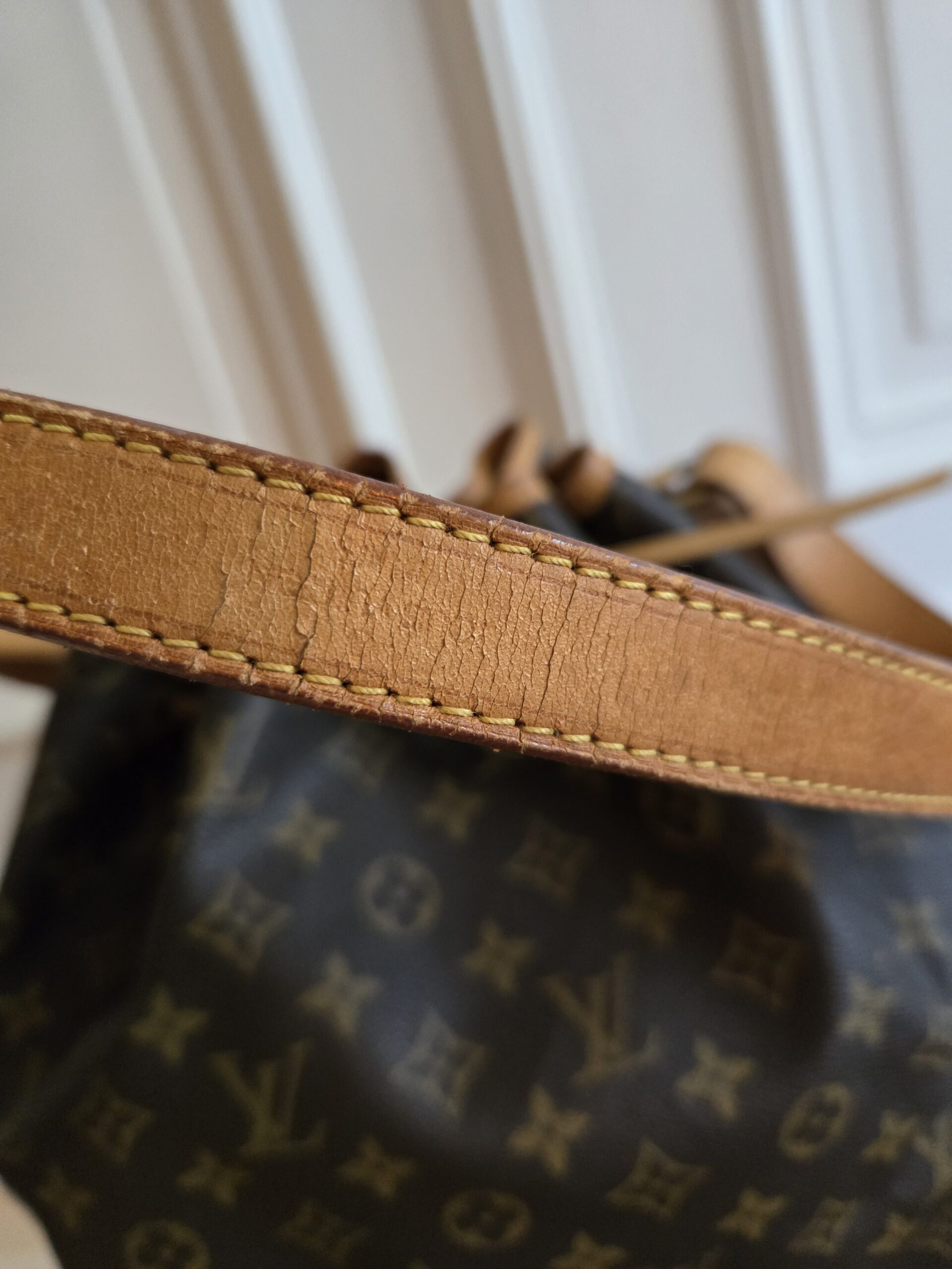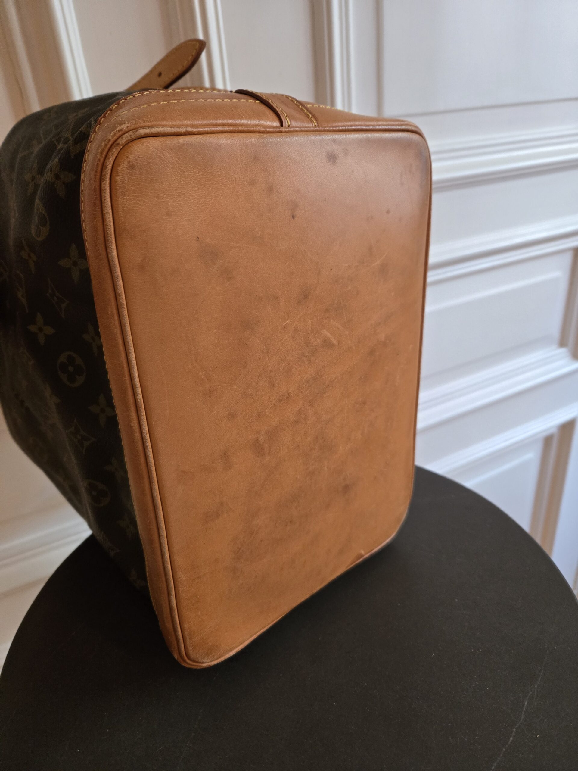 Die Tasche befindet sich in einem wunderschönen Vintage Zustand. Die Lederelemente sind alle sehr gut erhalten, teilweise weisen sie einige, dem Alter entsprechenden Gebrauchsspuren auf. Das Monogram Canvas ist super erhalten. Das Zugband weist geringe Gebrauchsspuren auf. Das Innere der Tasche ist absolut in Ordnung. Von dem D Ring im Inneren ist leider das Lederbändchen gerissen. Kann aber sicherlich für kleines Geld beim Sattler repariert werden.