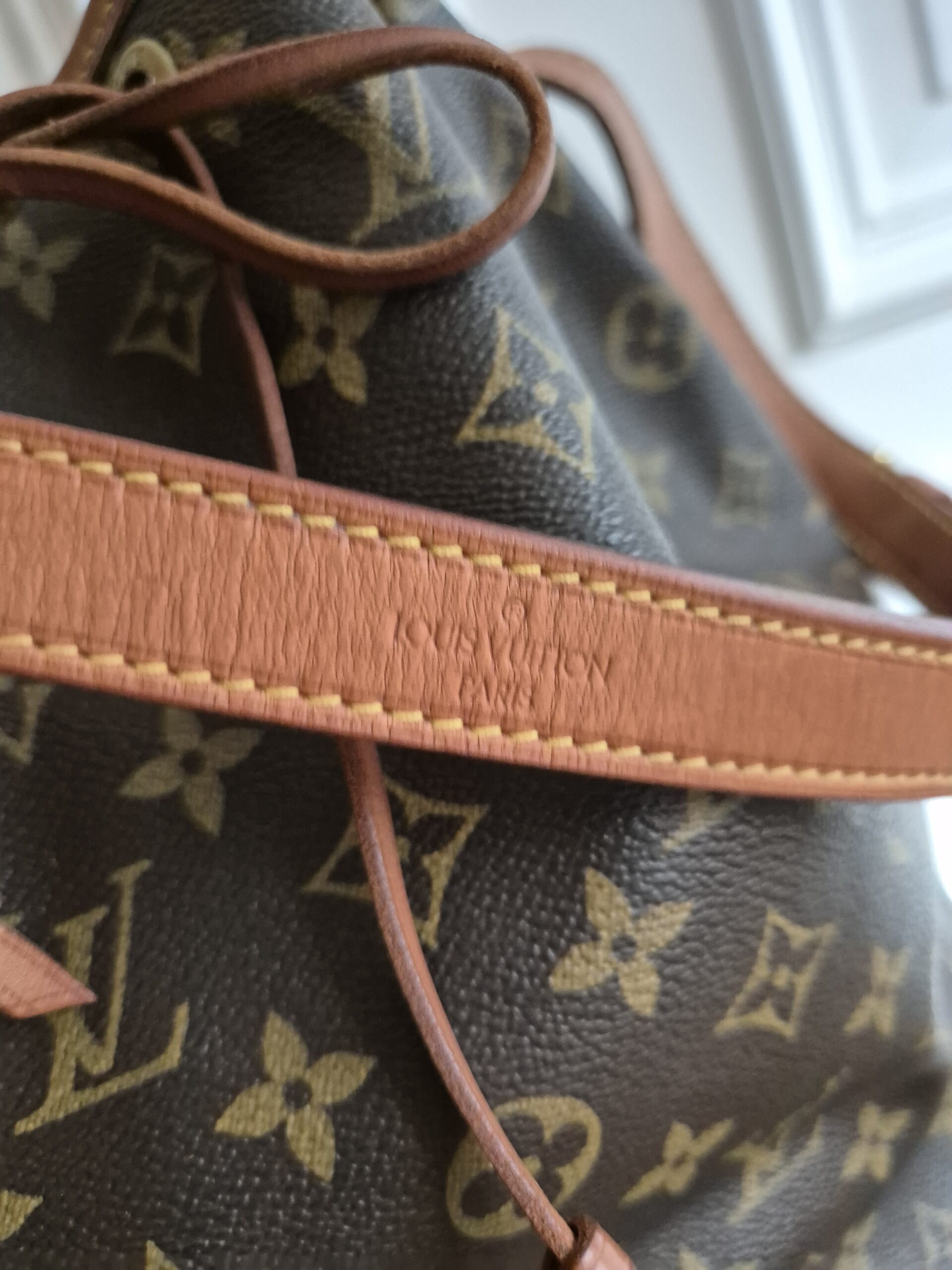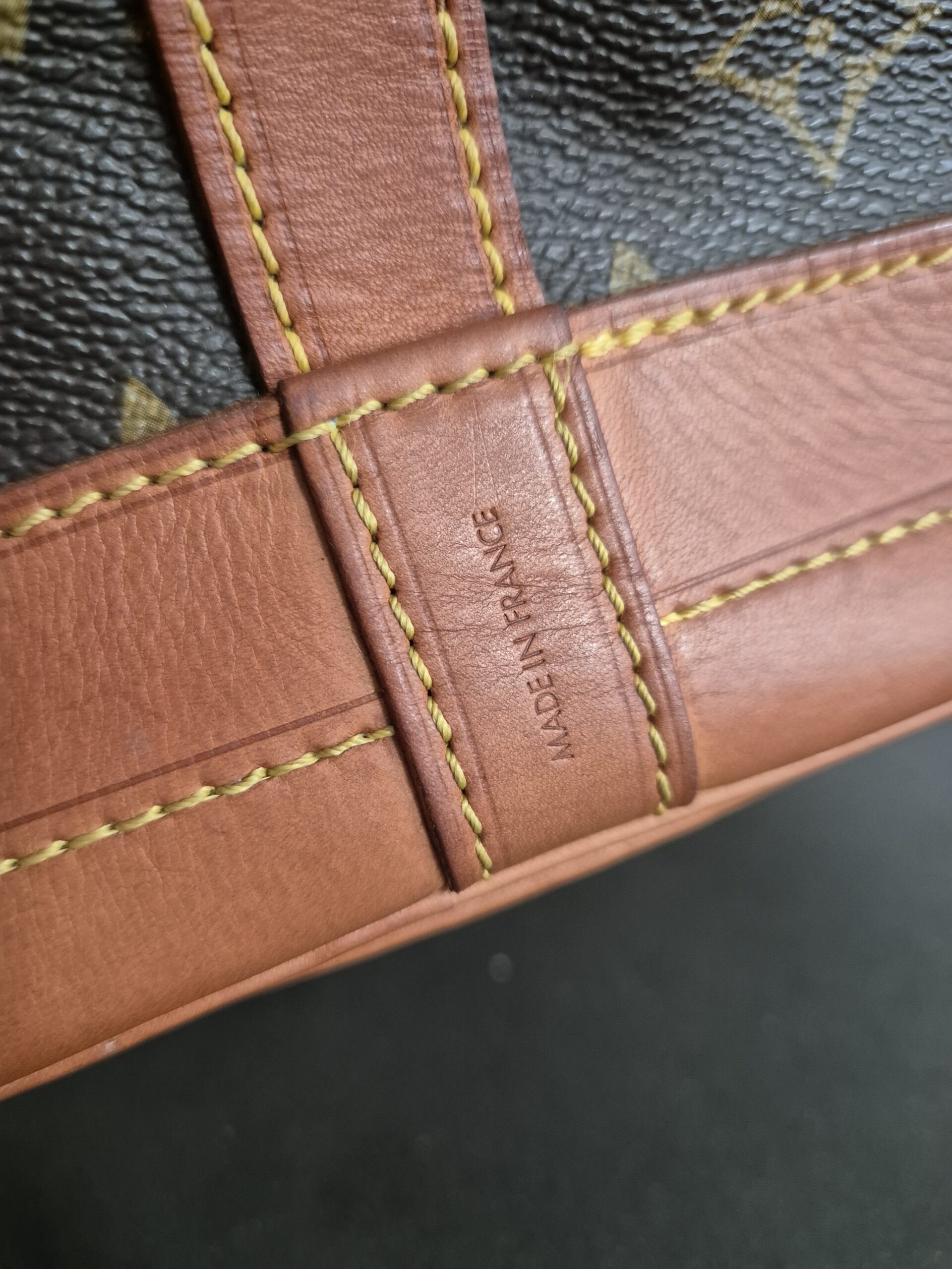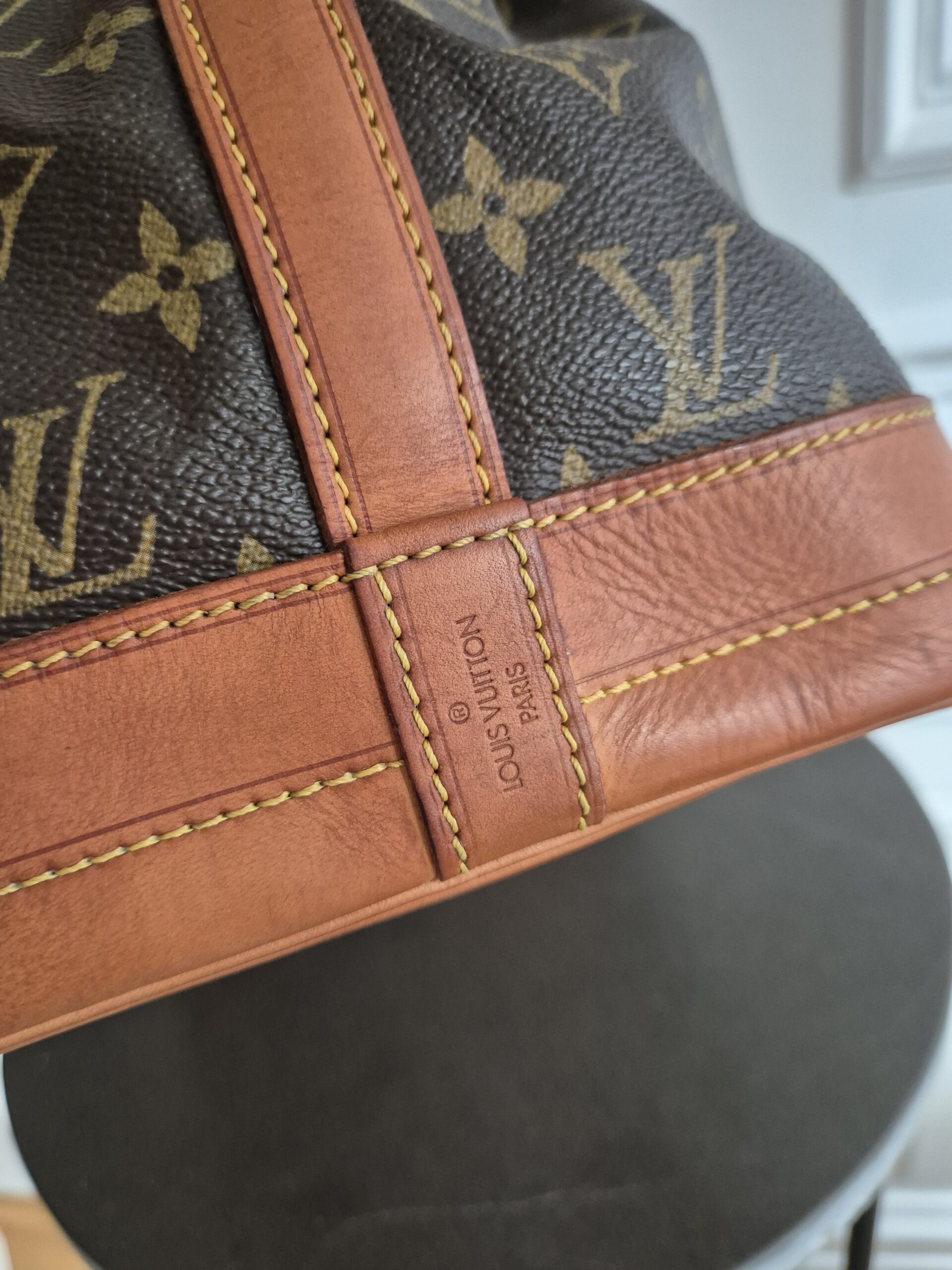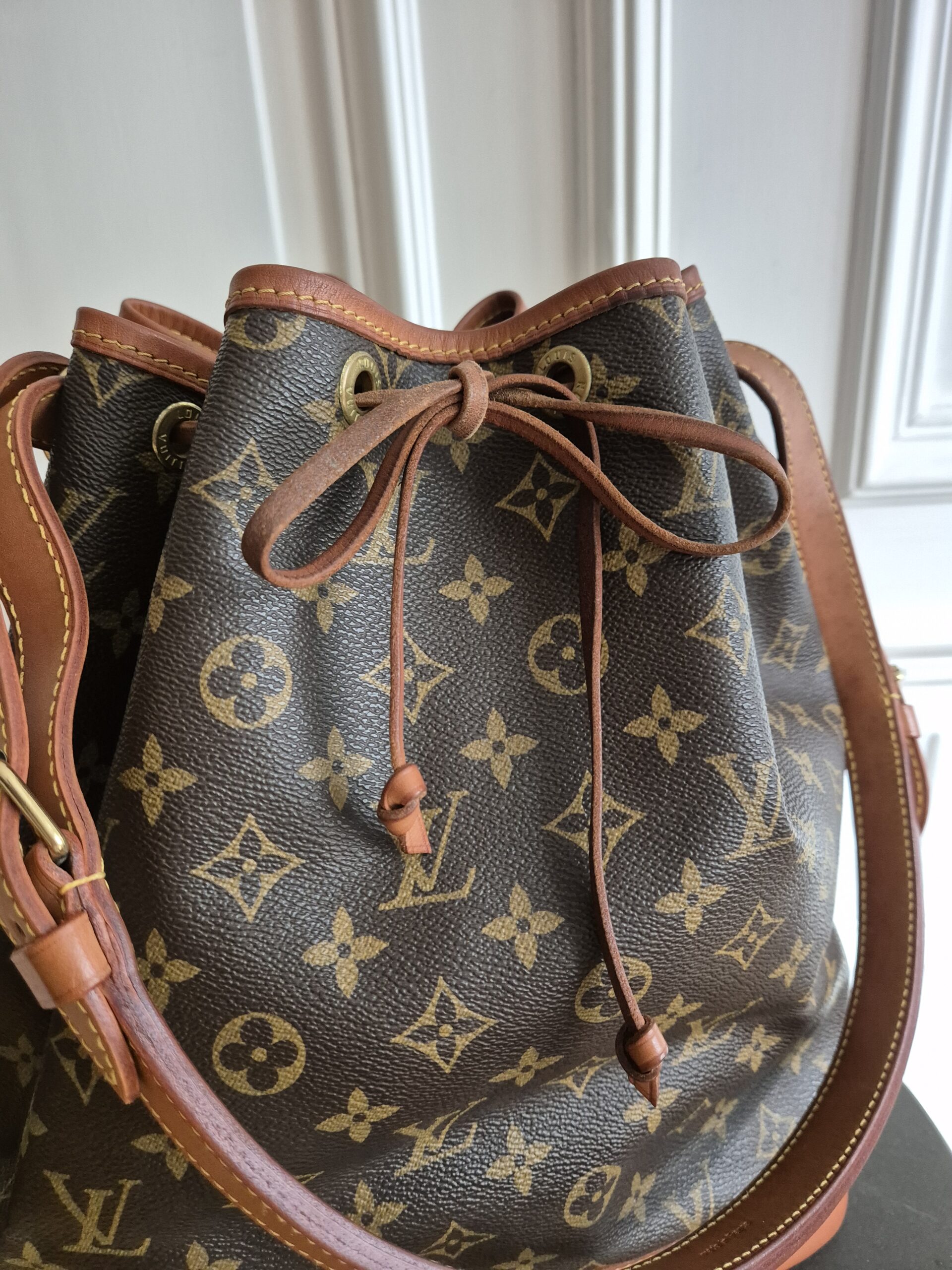 Die Tasche befindet sich in einem wunderschönen Vintage Zustand. Die Lederelemente sind alle sehr schön erhalten, der obere Lederrand ist absolut tadellos, das Zugband weist nur leichte Gebrauchsspuren auf. Das Monogram Canvas ist ebenfalls sehr gut erhalten. Alle Ecken sowie der Boden sind super erhalten.